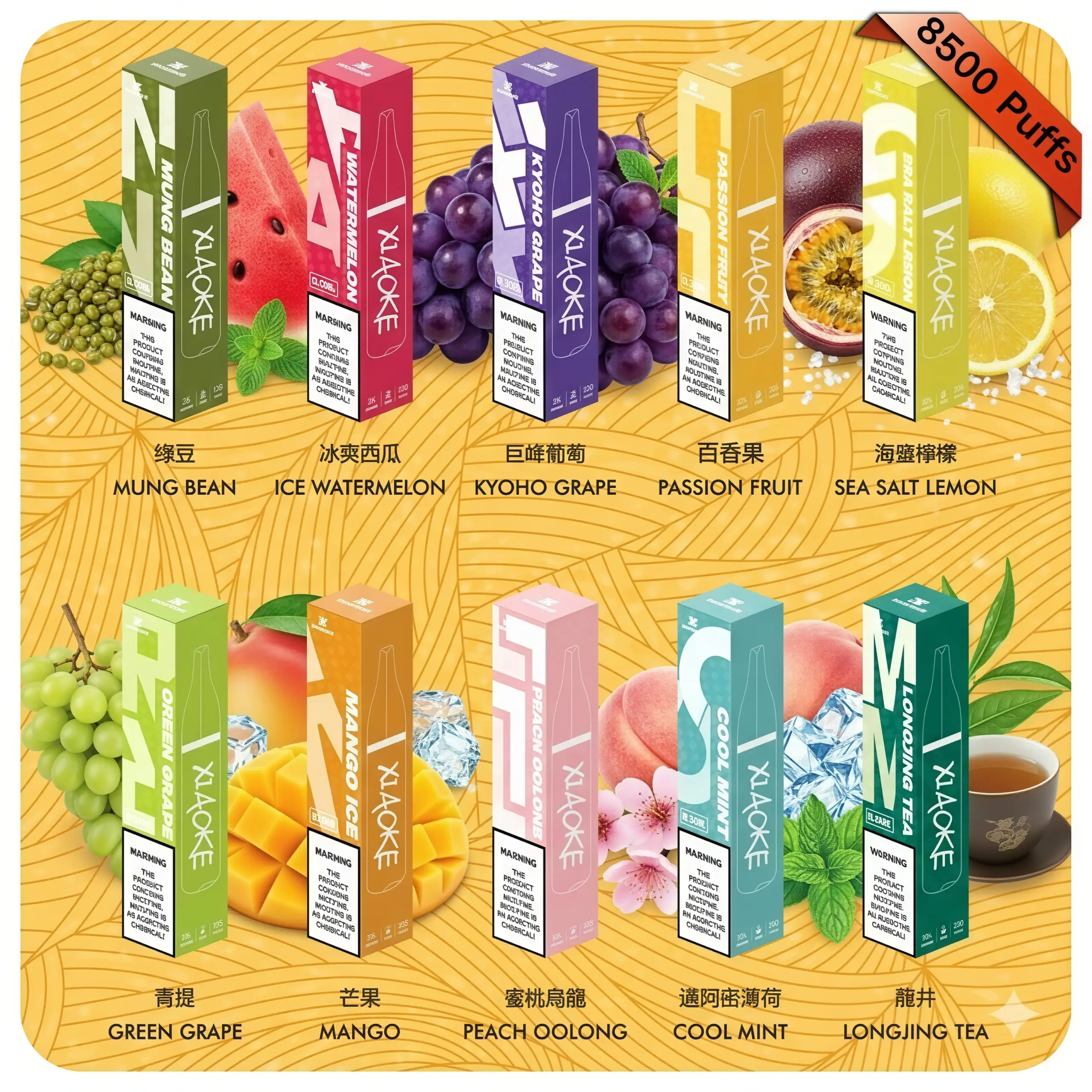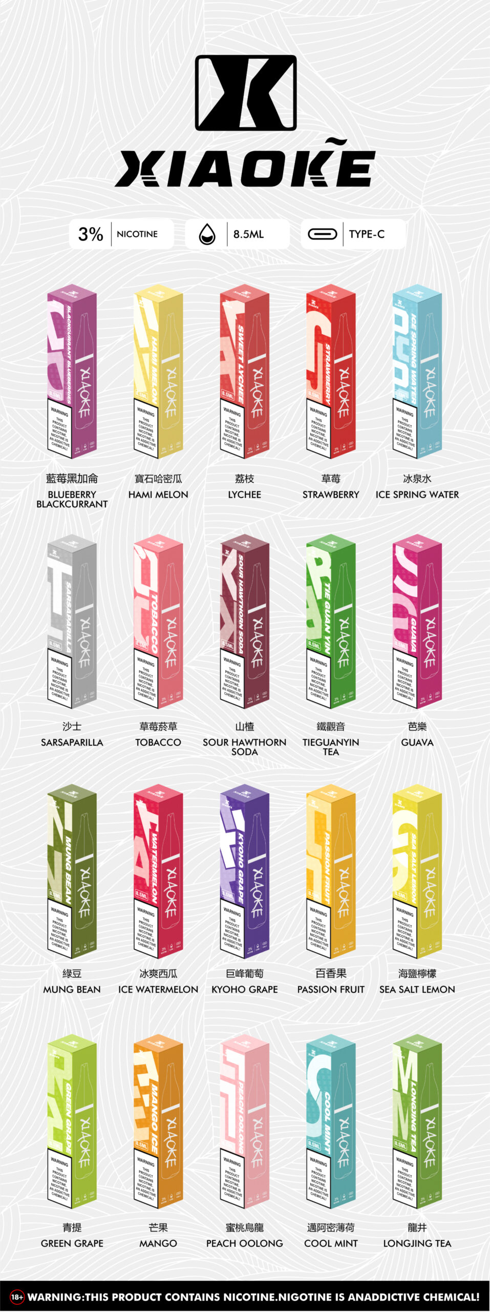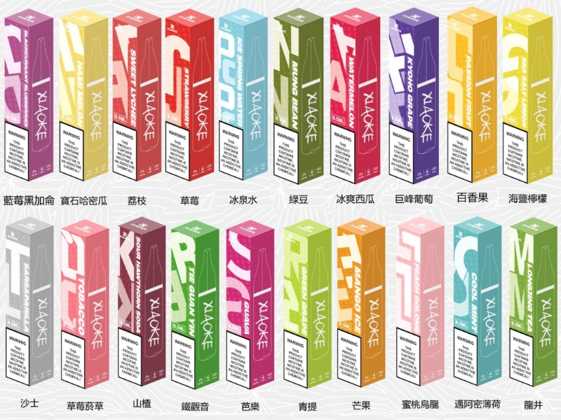 芭樂, 冰泉, 檸檬, 青提, 草莓, 沙士, 綠豆, 芒果, 鐵觀音, 百香果, 哈密瓜, 龍井茶, 巨峰葡萄, 草莓煙草, 冰爽西瓜, 蜜桃烏龍, 黑加侖藍莓, 邁阿密薄荷